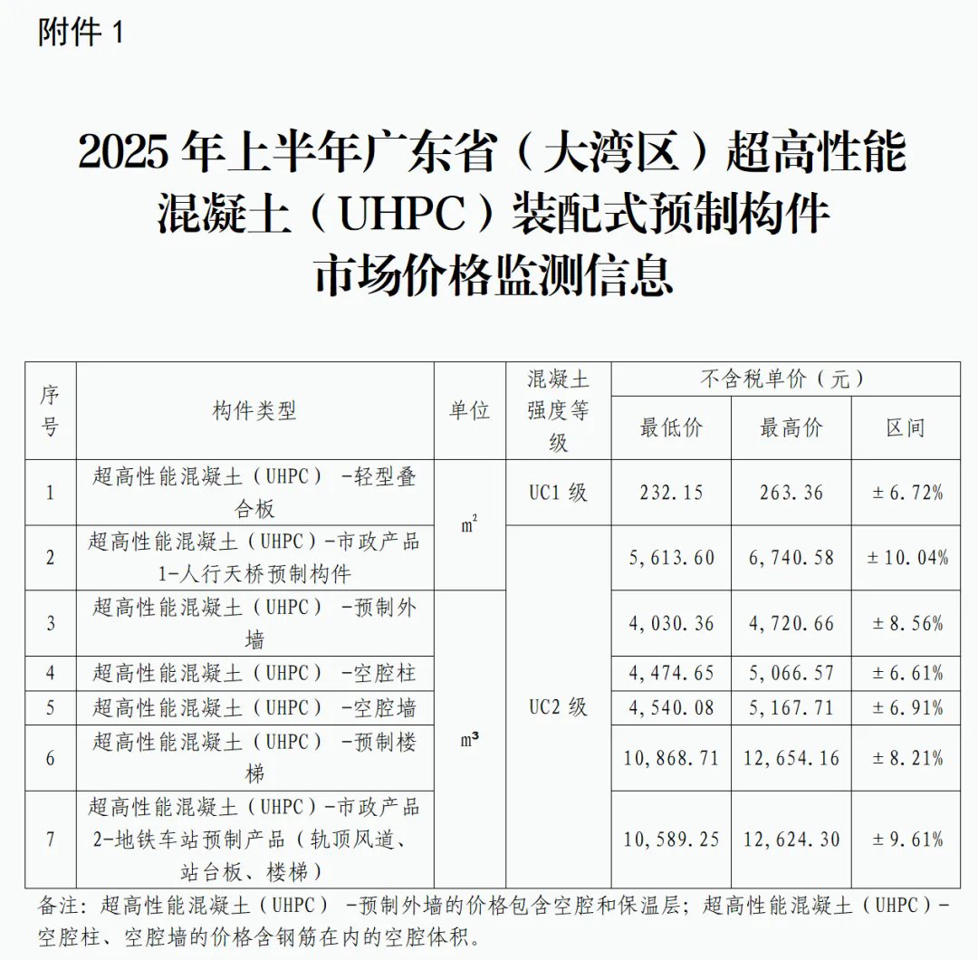 经广东省建设工程标准定额站联合广东省建筑材料行业协会装配式建筑分会组织力量监测、编审,现发布2025年上半年广东省(大湾区)超高性能混凝土(UHPC)和免拆底模钢筋桁架楼承板装配式预制构件价格监测信息(详见附件1、2),供各单位参考。相关事项说明如下: