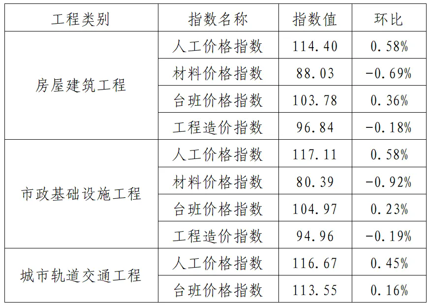 现将2025年8月我省房屋建筑工程、市政基础设施工程人工价格指数、材料价格指数、台班价格指数及工程造价指数,以及城市轨道交通工程人工价格指数、台班价格指数发布如下:
