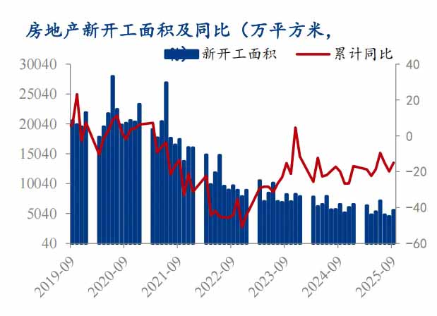 需求方面:建筑业缺乏改善基础,预计需求延续偏弱,1-9 月基建投资增速已降至 1.1%,受地方债务压力制约,预计后续增速进一步承压。截至 10 月 24 日,水泥直供量同比下降 12.4%,重点工程需求持续走弱。房地产领域需求延续低迷态势。1-9 月全国房地产新开工面积同比下降 18.9%,行业下行趋势仍在延续,短期内新开工规模预计维持低位运行。