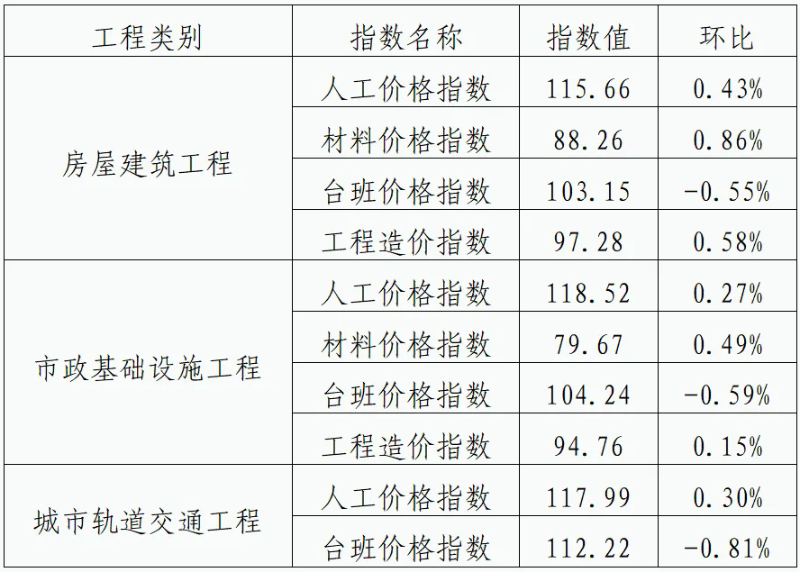 现将2025年11月我省房屋建筑工程、市政基础设施工程人工价格指数、材料价格指数、台班价格指数及工程造价指数,以及城市轨道交通工程人工价格指数、台班价格指数发布如下:
