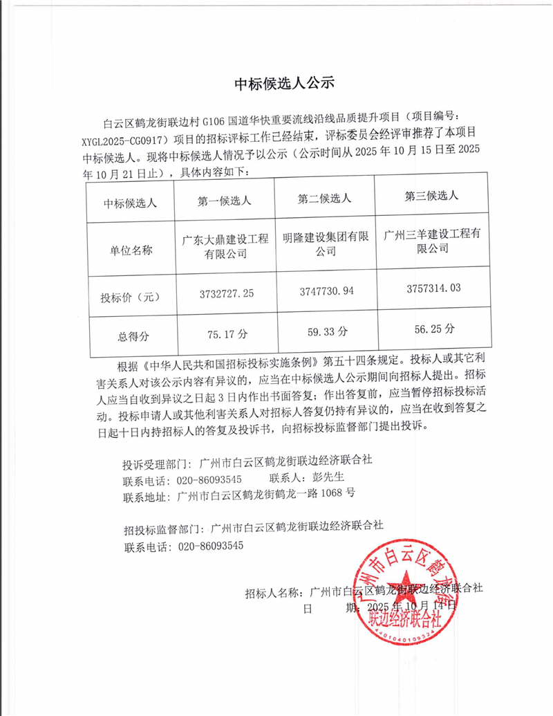 白云区鹤龙街联边村G106国道华快重要流线沿线品质提升项目中标候选人公示
