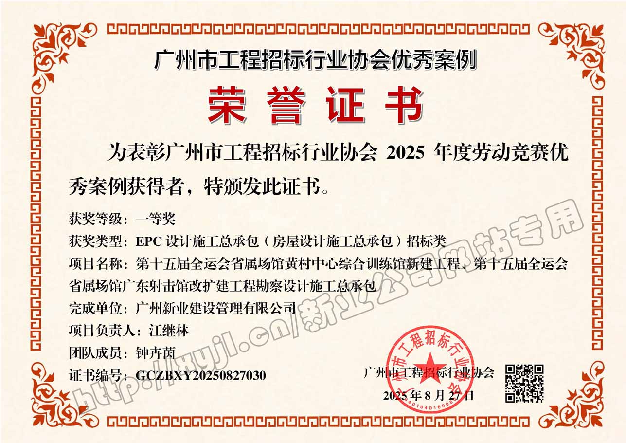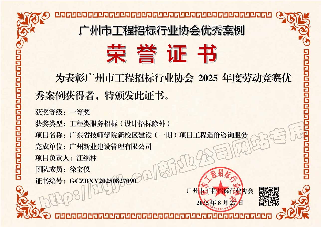 祝贺:广州新业公司2025年广州市工程招标行业协会劳动竞赛评选获一等奖