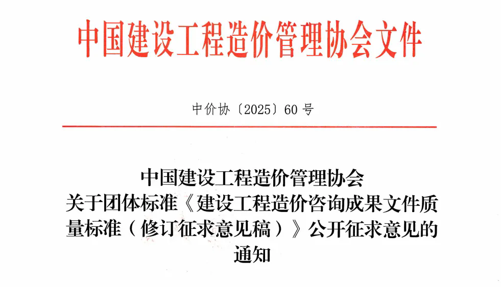 中国建设工程造价管理协会组织修订了团体标准《建设工程造价咨询成果文件质量标准》(详见附件1、2),现向社会公开征求意见。